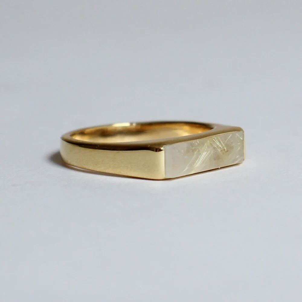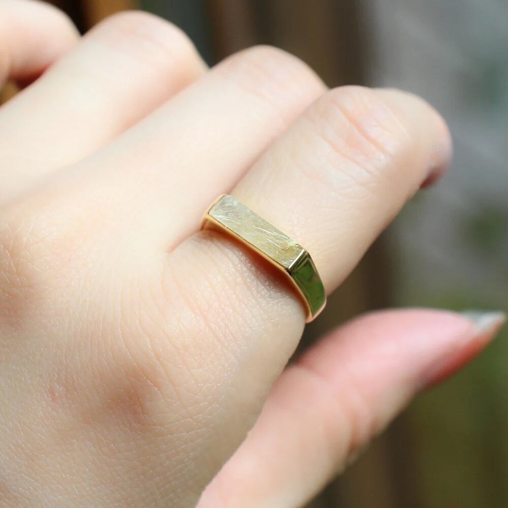 特徴である金色の針は水晶の成長とともに長くなるといわれ、一つのリングの中に鉱物の神秘をみることができます。
